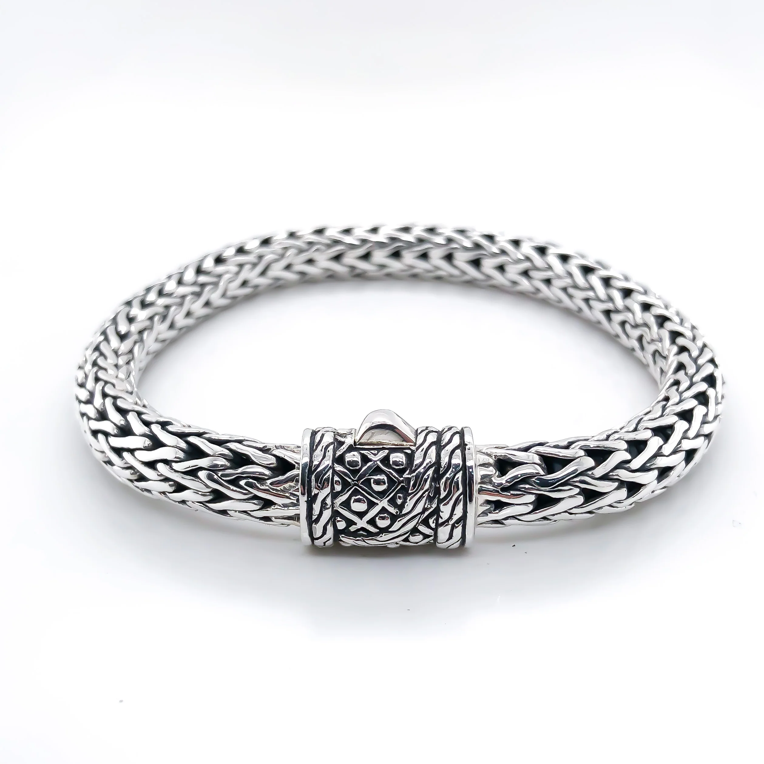 Classy and yet gorgeous piece of jewelry, this classic weave bracelet features a handcrafted artistic Balinese Crescent design, a lustrous 925 sterling silver body, an 8mm chain width, and a secure push-button enclosure.